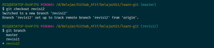 Nah, kita cek di local ternyata perubahan terbaru di branch revisi1 belum ada. Maka kita bisa jalankan perintah git pull origin revisi1. Berikut ini hasilnya