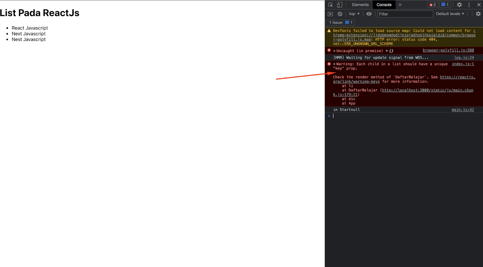 Ketika menggunakan list pada react js kita dianjurkan untuk menggunakan key. Apa itu key? Key adalah sebuah identitast unik yang tidak akan ada duplikat pada list yang lain. Jadi sifatnya hampir mirip seperti id pada setiap element html. Kenapa perlu ini? Karena hal ini akan membantu react mengidentifikasi item mana yang berubah, ditambahkan dan dihapus, jadi diharapkan tidak ada kesalahan dalam melakukan aksi terhadap sebuah item/list.